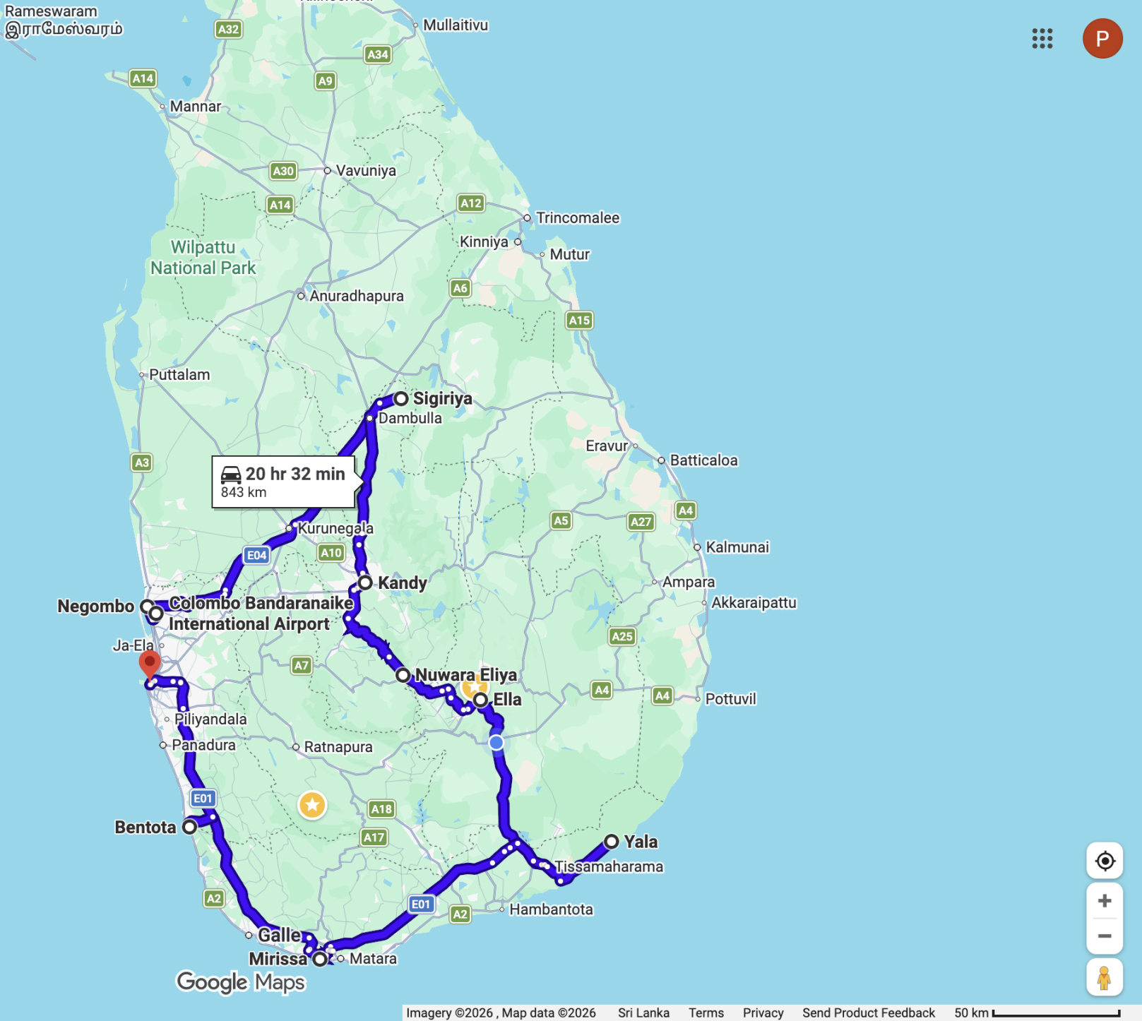 Airport → Negombo → Sigiriya → Kandy → Nuwara Eliya → Ella → Yala → Mirissa → Bentota → Colombo → Airport