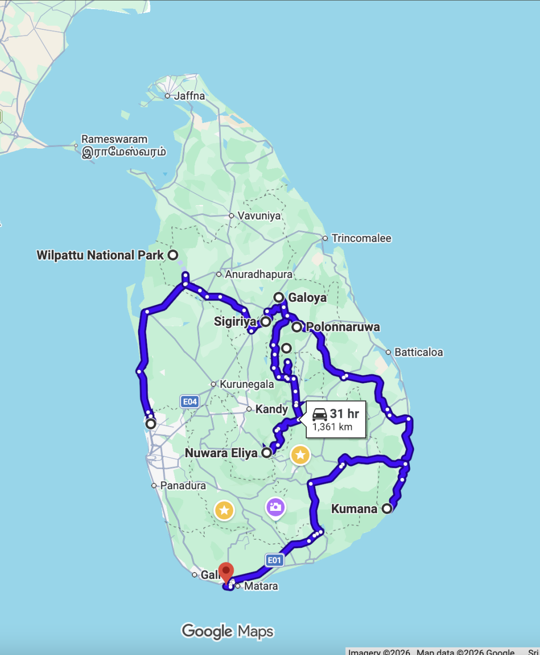 Airport โ Wilpattu โ Sigiriya โ Polonnaruwa โ Wasgamuwa โ Nuwara Eliya โ Gal Oya โ Kumana โ Mirissa โ Airport